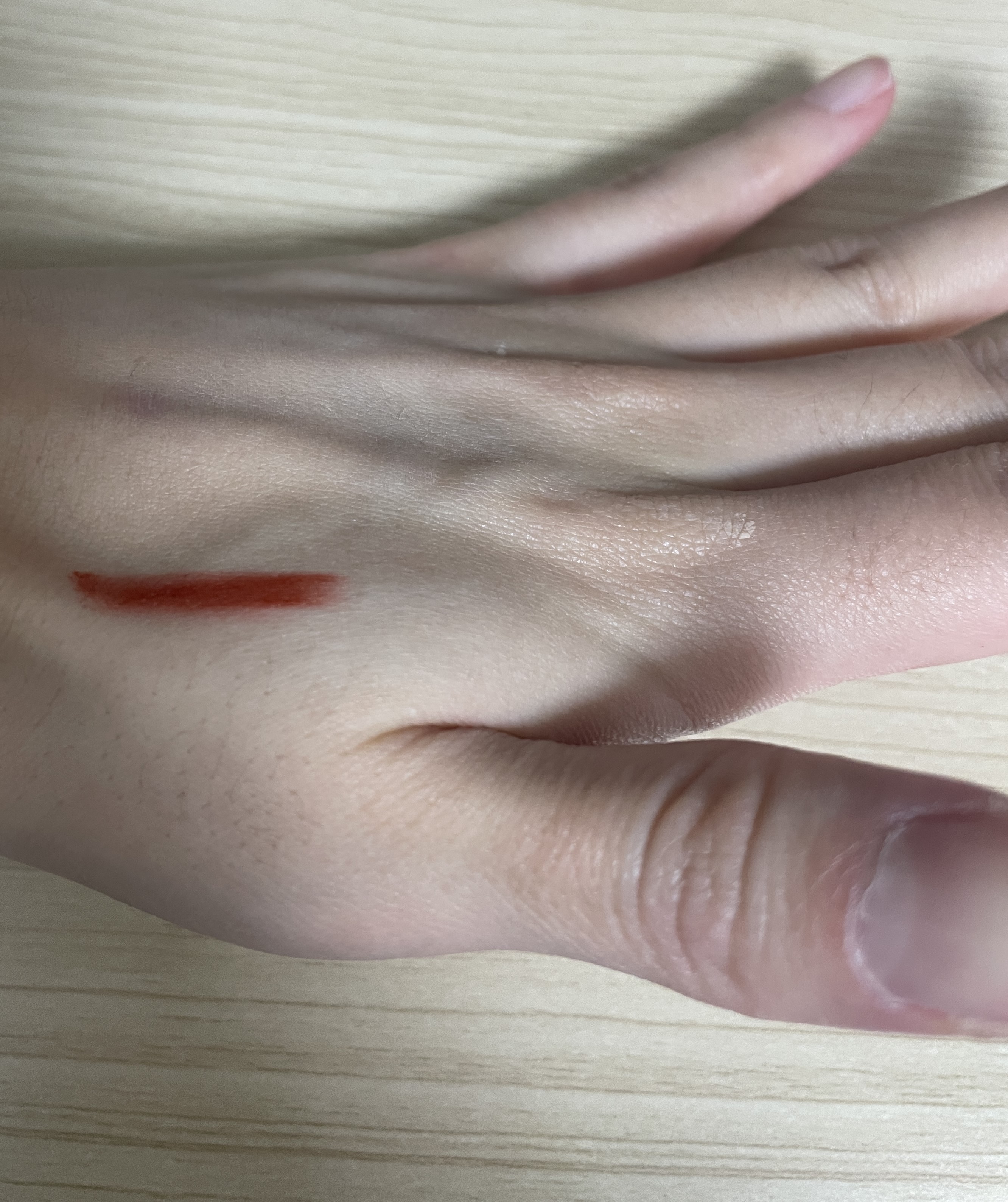 손등에 발색해보면 웜톤에 딱맞는 브릭레드색인데 개인적으로 색은 가을웜톤의 것이라고 생각하지만 나는 봄웜이고 봄웜에게도 찰떡인 색인것 같다.(근데 무슨 손등에 발색하는 건데 경직 되어있나....)