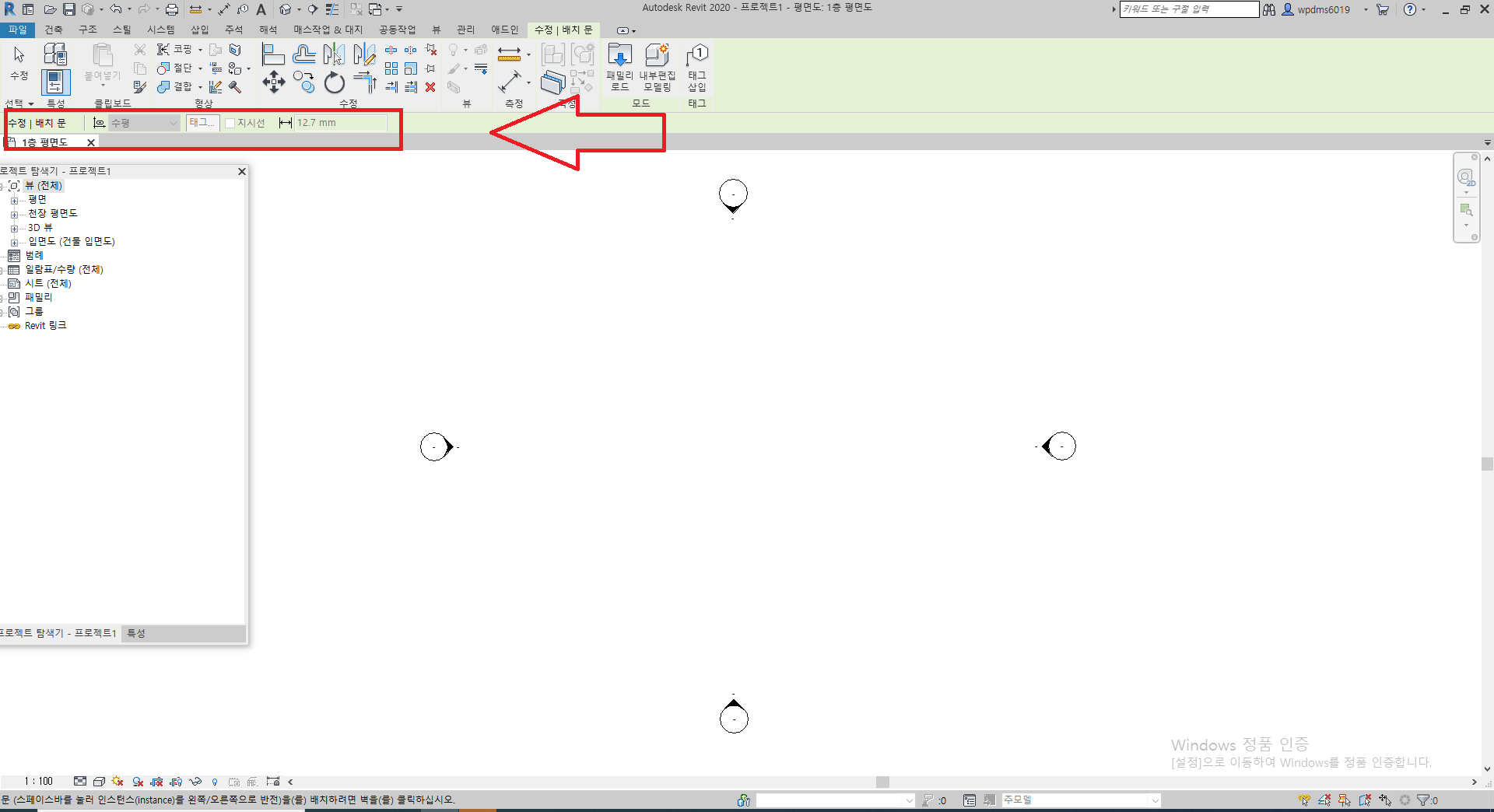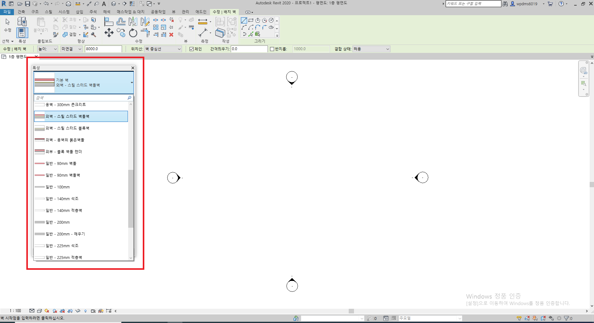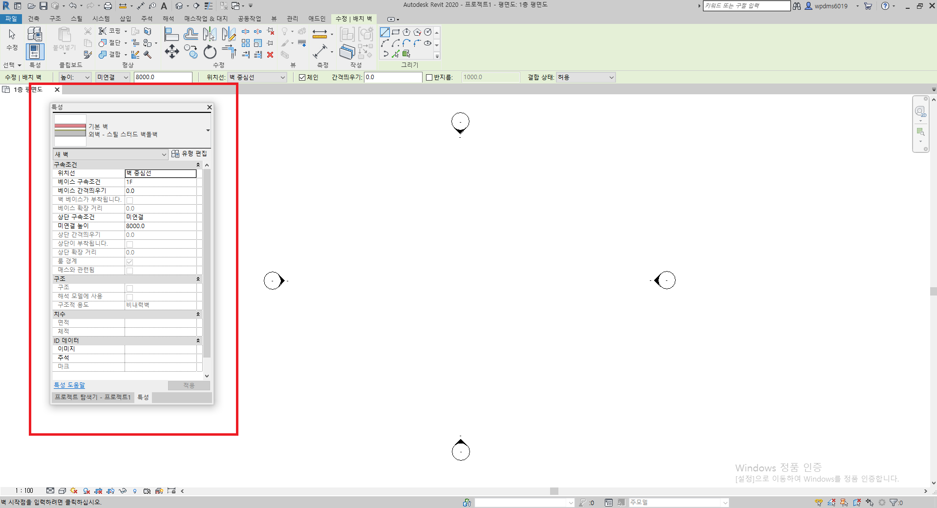 Revit에서 요소의 특성을 정의하는 다양한 매개변수를 확인하거나 수정할 수 있습니다. (창을 드래그 하여 작업화면의 원하는 위치에 배치할 수 있습니다.)