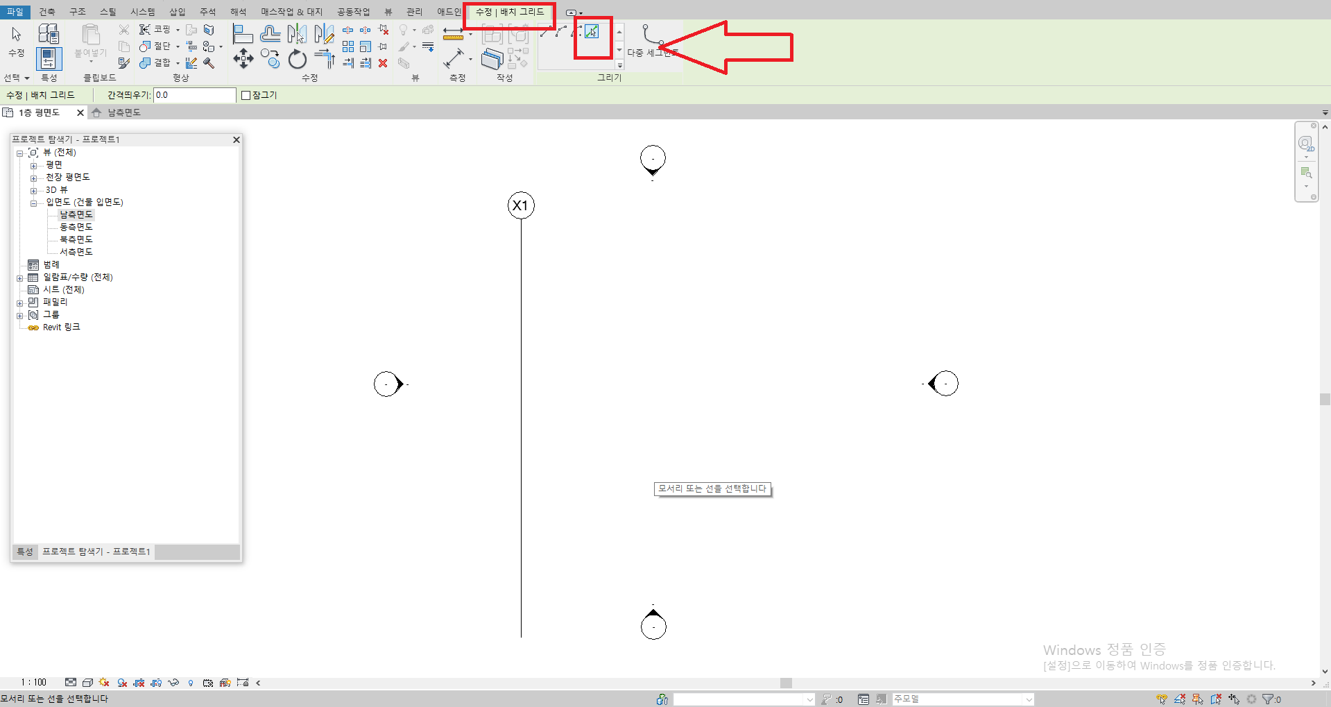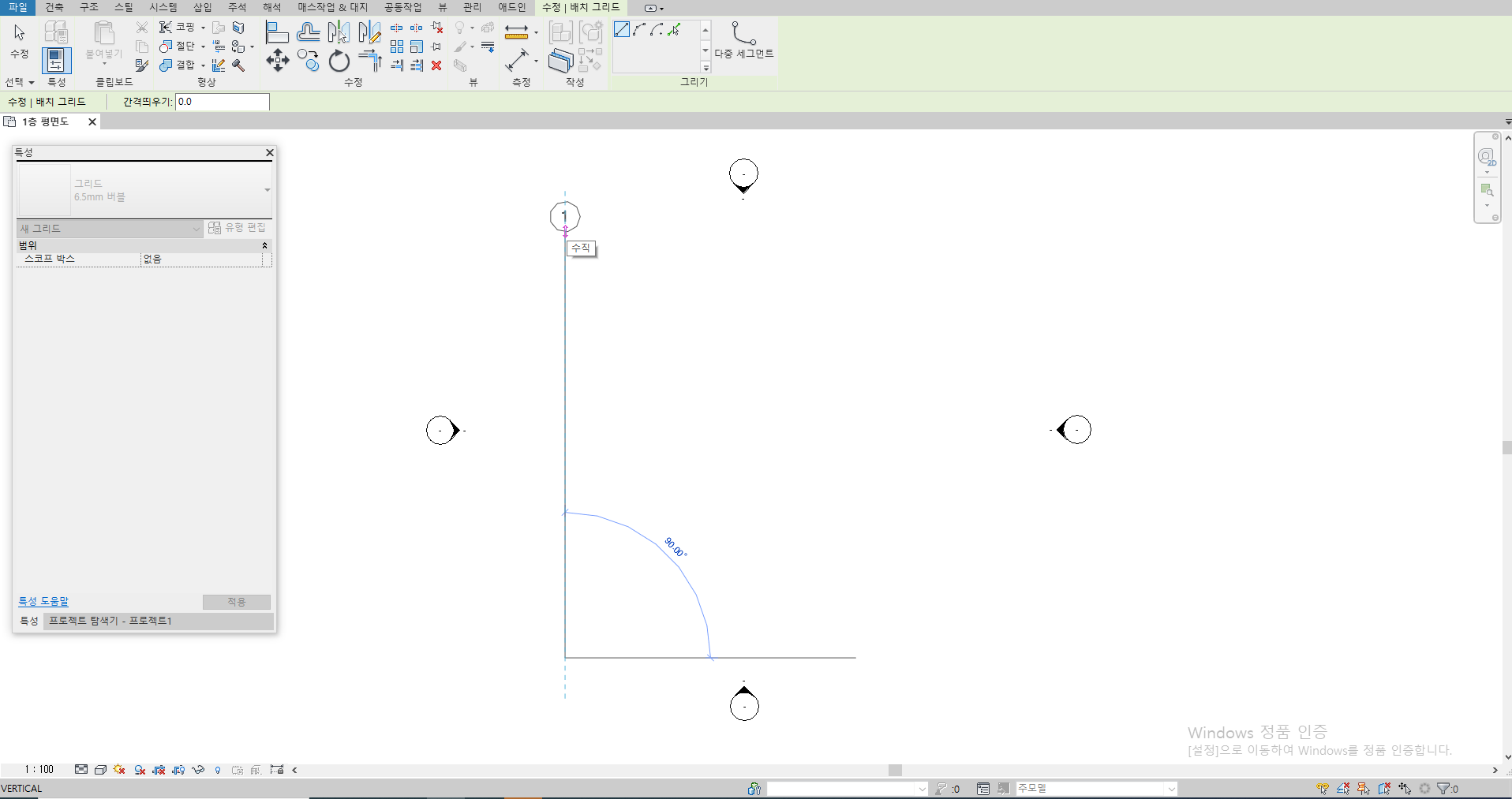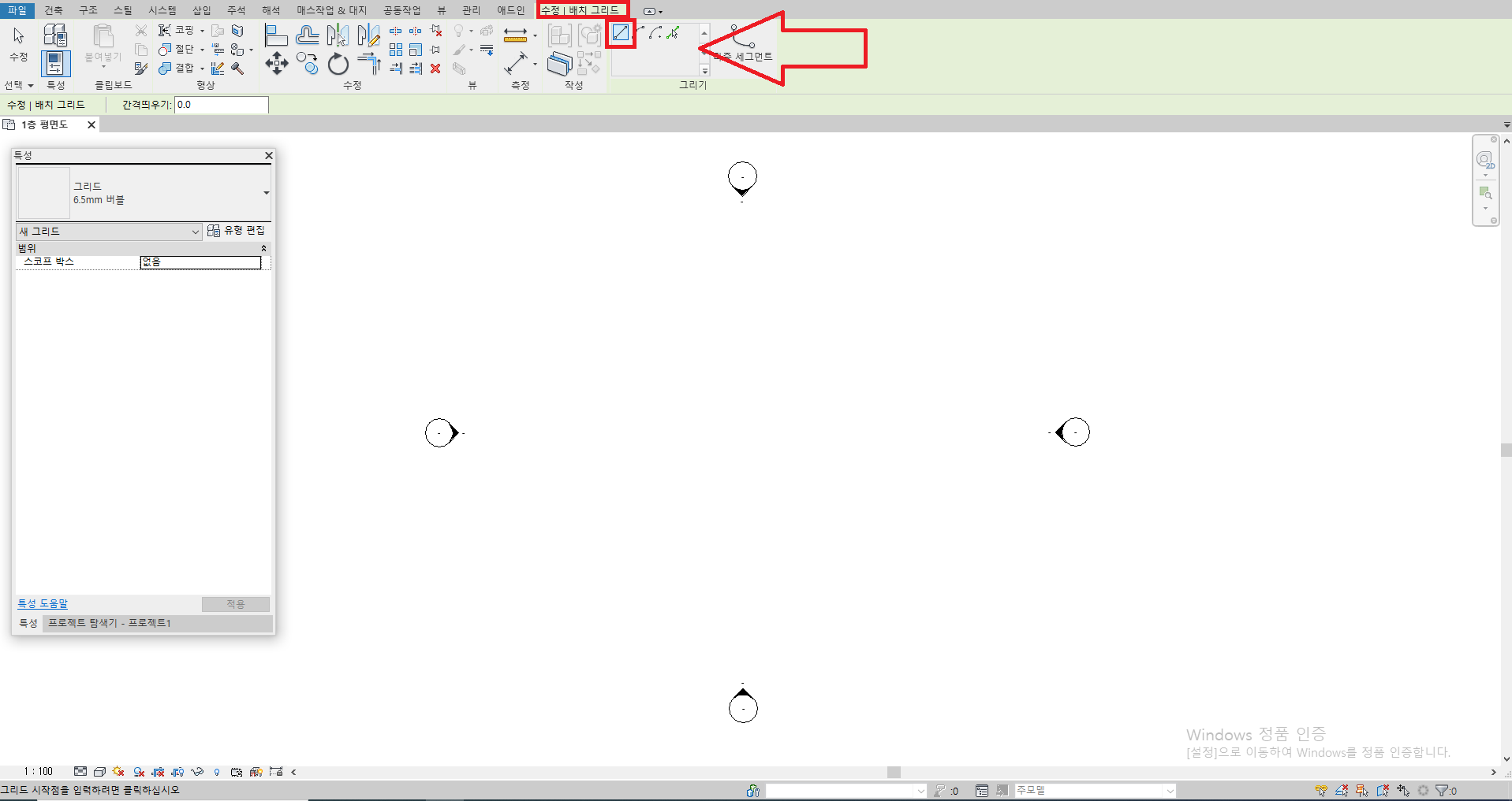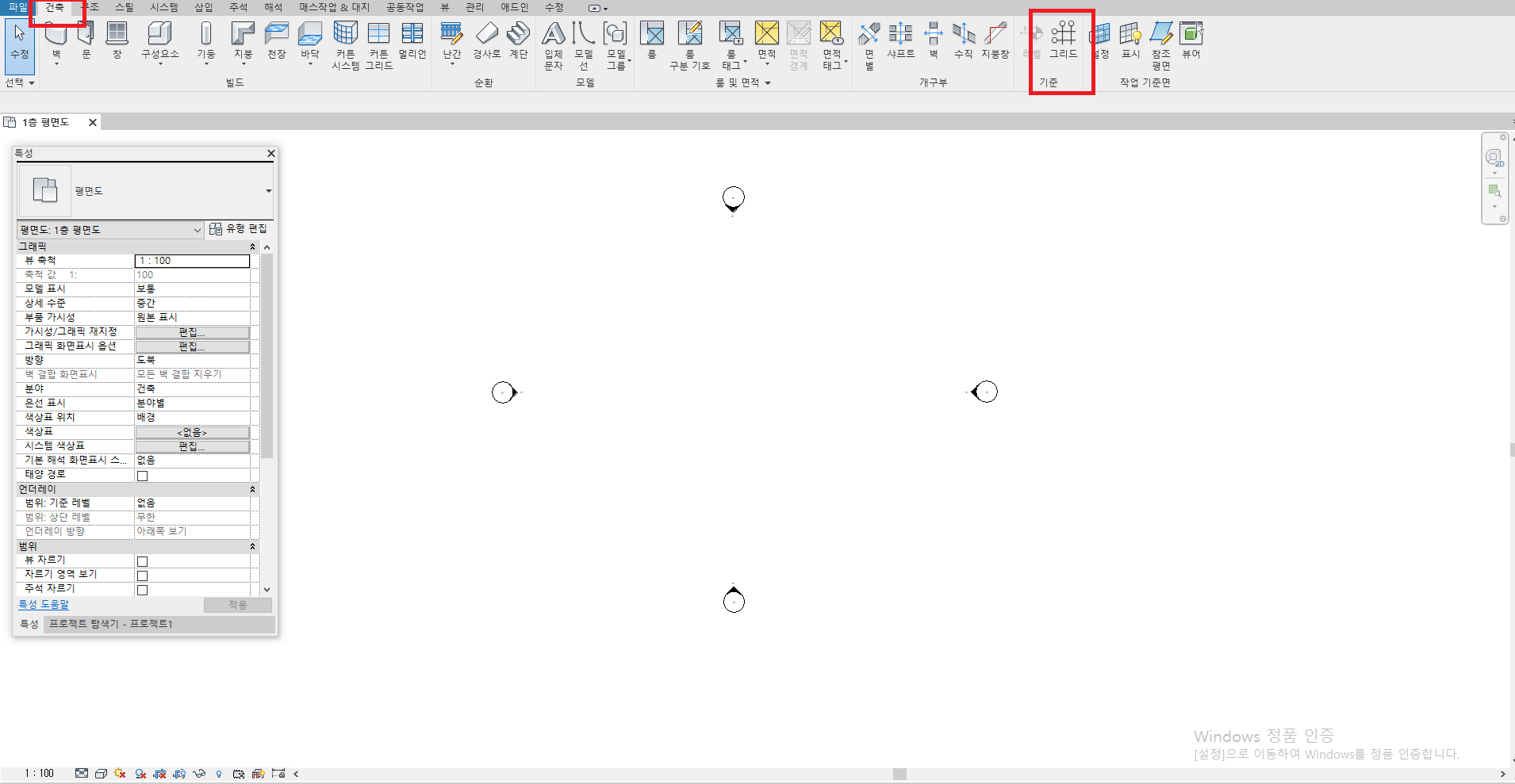 [건축] 탭에서 [기준] 패널의 [그리드]를 클릭해 줍니다.