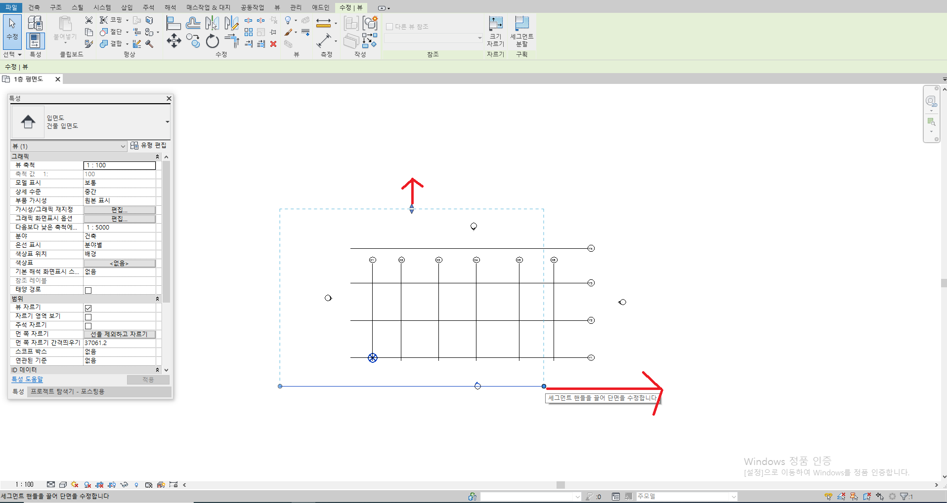 점선의 화살표 부분과 실선의 점 부분을 클릭해서 드래그 해서 뷰 범위를 조절합니다.