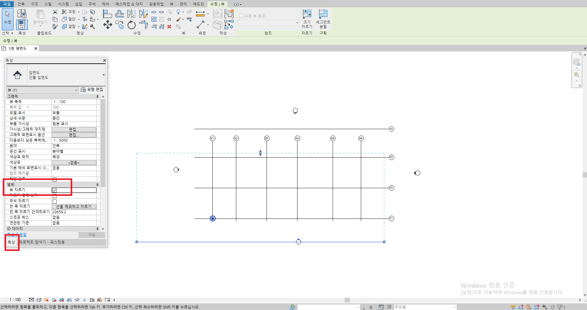 이 때 [특성] 창에서 '범위' 매개변수의 '뷰 자르기'를 체크해 주세요.